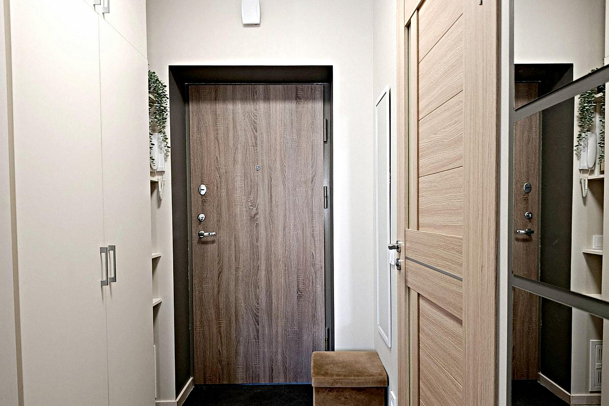 The kitchen is combined with the living room: This stylish room features all the necessary appliances, kitchen utensils, a dining table, air conditioning, a fold-out double sofa bed, and a Smart TV.