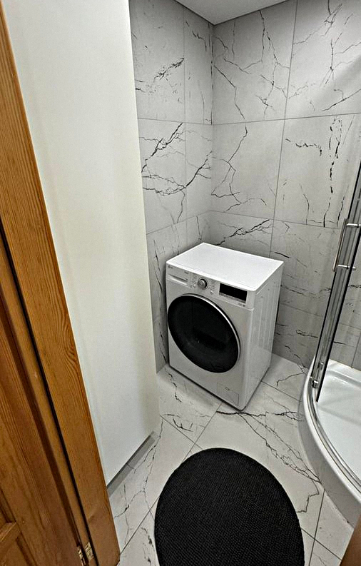 Bathroom: Shower stall, sink with mirror, and washing machine.
