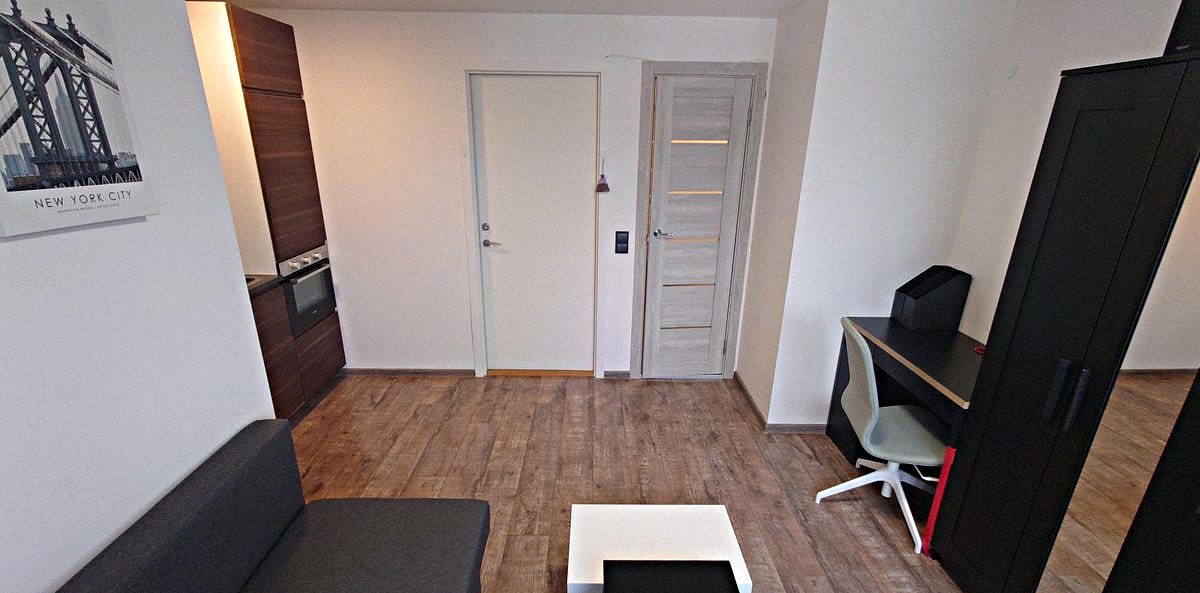 The bedroom is combined with the kitchen. This warm room features a double sofa bed, a desk, a mirrored wardrobe, a Smart TV, and all necessary appliances and kitchen utensils.