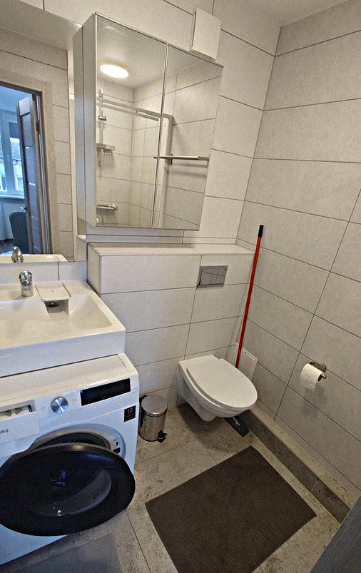 Bathroom: A shower stall, a vanity with a mirror, a washing machine, and a toilet.