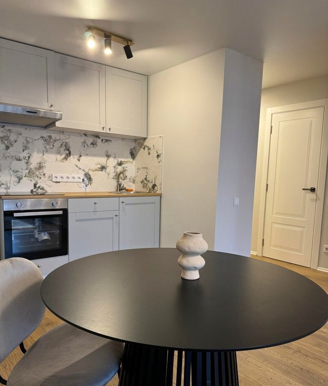 Living room combined with kitchen: Spacious room with all necessary appliances, kitchen utensils, a small fold-out sofa, and a dining table.
