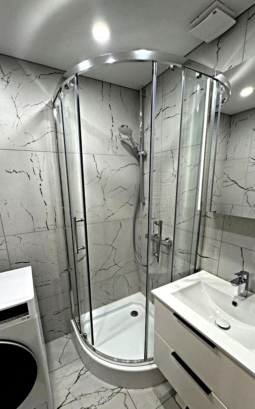Bathroom: Shower stall, sink with mirror, and washing machine.