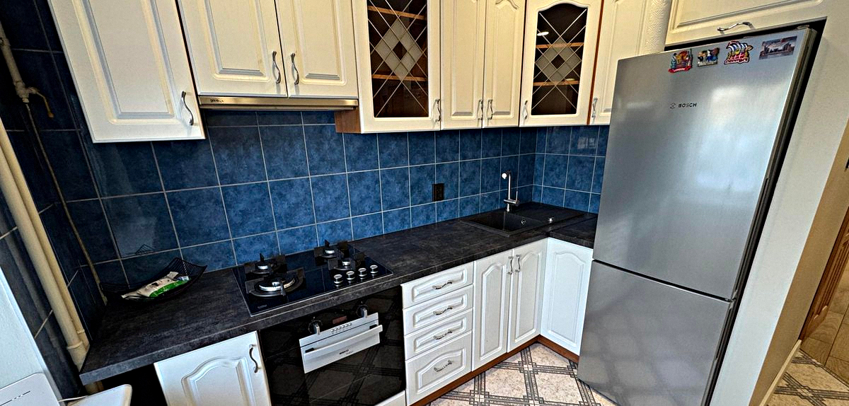 Kitchen: Sunny room with all necessary appliances, kitchen utensils, and a dining table.