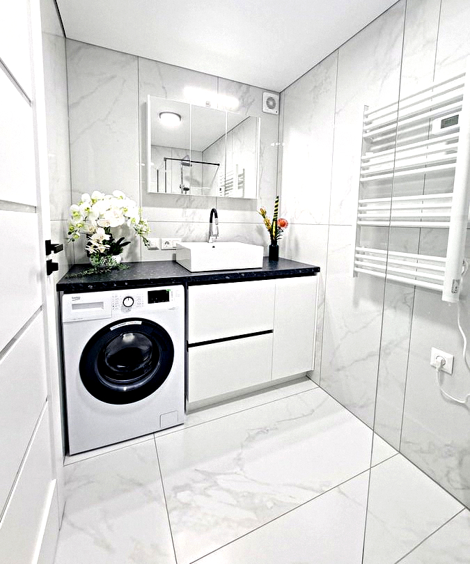 Bathroom: A shower, a sink with a mirror, a washing machine, and a toilet.